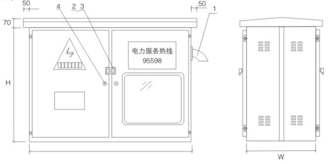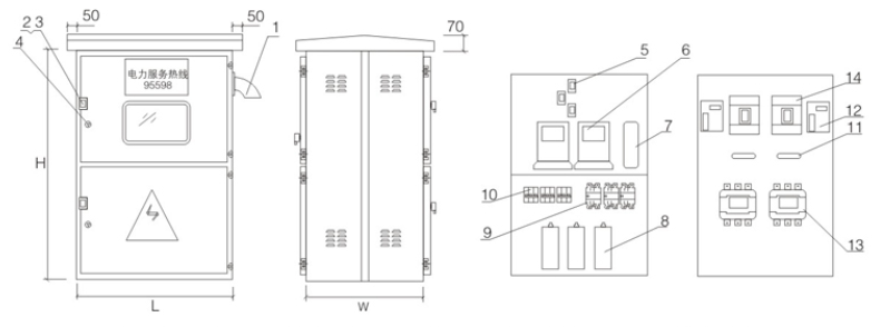 1. Inlet cable through pipe 2, door lock (open lock) 3, door lock rain box 4, door lock (hidden lock) 5, current transformer 6, meter 7, junction box 8, capacitor 9, switching fused contactor 10, small circuit breaker 11, isolation switch 12, zero sequence transformer 13, leakage current circuit breaker 14, outgoing AC contactor 15, outgoing air switch